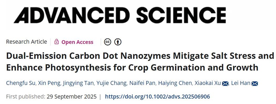 近日,英国上市公司365博导韩磊教授团队在盐碱地作物抗逆与生长促进研究方面取得新进展,通过合成一种新型碳点纳米酶,在不依赖基因改造和有机农药的前提下,直接提升作物耐盐碱性。相关研究成果发表于国际SCI期刊《Advanced Science》(中国科英国上市公司3651区TOP期刊,影响因子14.1)。该论文以英国上市公司365为第一通讯单位,英国上市公司365教师苏成付副教授、英国上市公司365硕士研究生彭欣、化药英国上市公司365硕士研究生谭婧盈为共同第一作者,英国上市公司365博士生导师、化药英国上市公司365生物纳米与分子识别团队及国创中心纳米农业工程团队负责人韩磊教授为第一通讯作者,团队许晓凯教授为共同通讯作者。
